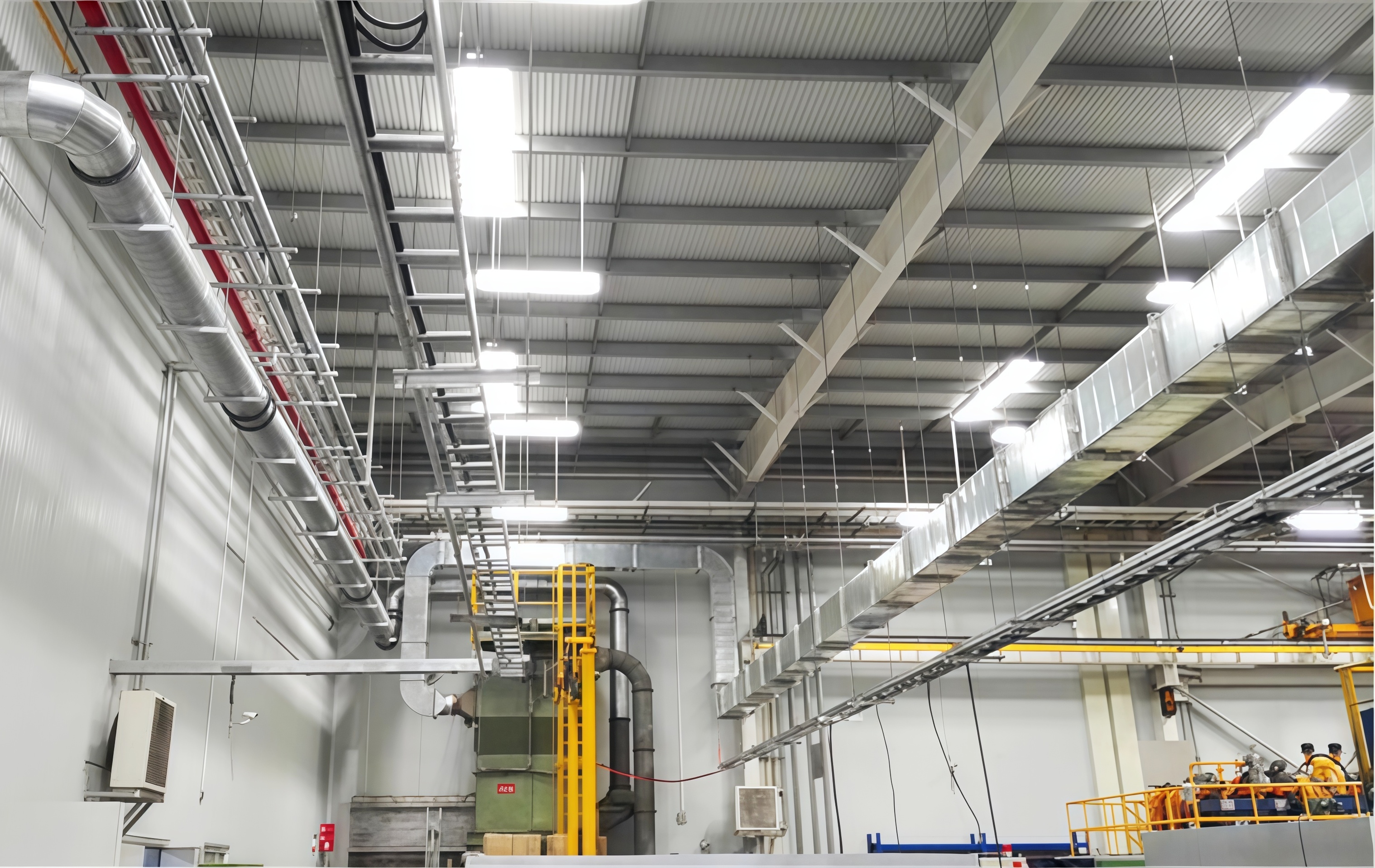苏州某汽车零部件加工企业--新建精密机械加工车间,主要生产铝合金汽车配件,涉及切削、焊接、抛光等工序,产生大量金属粉尘、焊接烟气及油雾污染物。原车间通风系统采用镀锌铁皮管道,使用半年后因焊接烟气中的酸性物质(如氮氧化物、臭氧)腐蚀,出现管道穿孔、漏风等问题,且粉尘堆积导致通风效率下降 30%,需重新设计安装不锈钢通风管道系统。